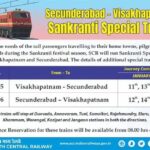 సంక్రాంతి రద్దీ దృష్ట్యా సౌత్ సెంట్రల్ రైల్వేస్ విశాఖ-సికింద్రాబాద్ మధ్య ప్రత్యేక రైళ్లను నడపడాలని నిర్ణయించింది. జనవరి 11-17 వరకు ఈ ప్రత్యేక రైళ్లు అందుబాటులో ఉంటాయి. జనవరి 11న రాత్రి...